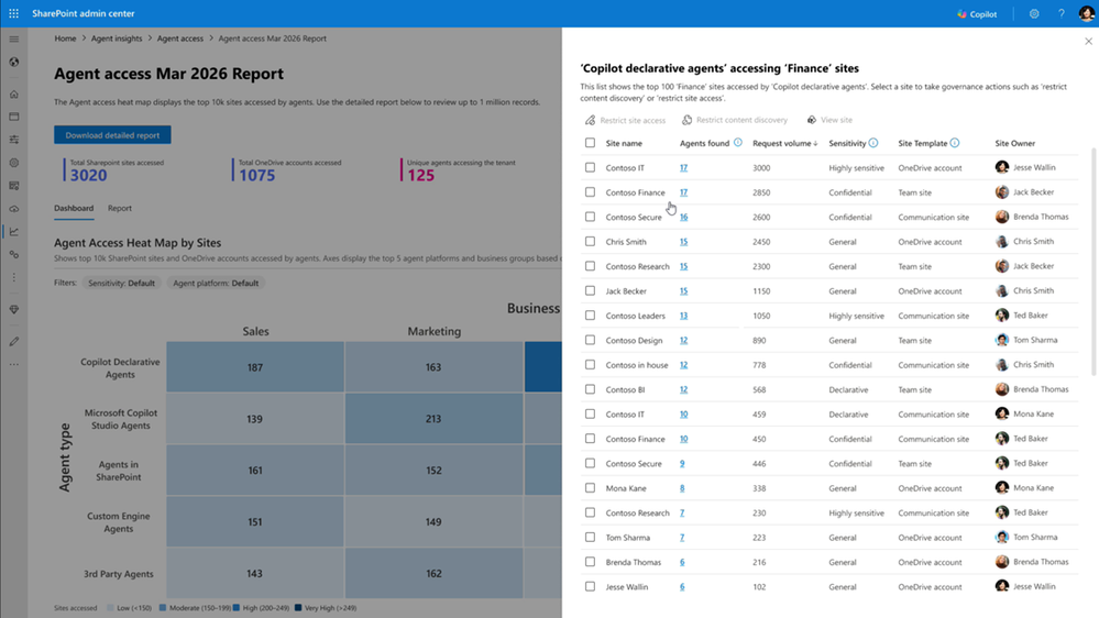 Agents are most effective when working on your organization’s relevant data. Agent Access Heatmap offers rich visual insights on agent access with additional dimensions like sensitivity and agent platform. This gives admins visibility into both the sensitivity of the content being accessed and the frequency of access. Admins now have effective tools for pausing agentic access to a site or scoping more granular access.
