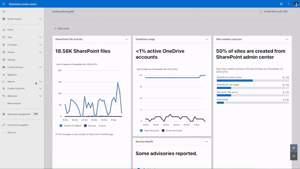Helps admins stay in control of content from creation to end of life by identifying inactive, outdated, and ownerless sites and enabling actions like reviews and archival.