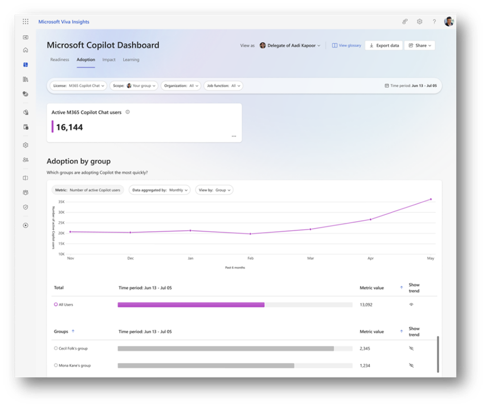 The Copilot Dashboard consolidates adoption metrics for both Microsoft 365 Copilot and Copilot Chat, giving business leaders a unified view of how these tools are used across their organization. Customers can use the insights from Copilot Chat reporting to assess overall AI adoption, improve enablement efforts for groups that are lagging, and optimize Microsoft 365 Copilot licensing by identifying your most active groups.