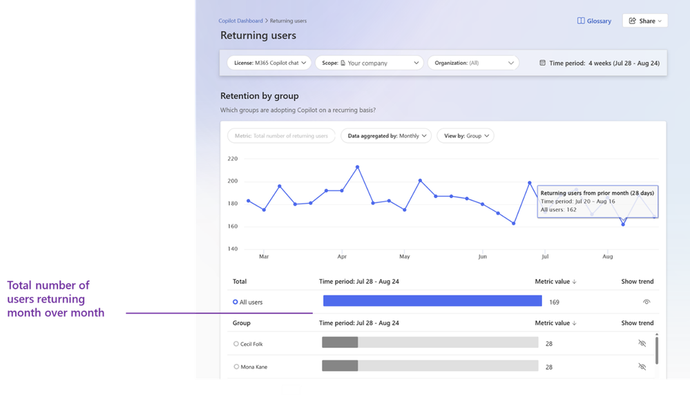 - Copilot Chat Reporting: Track adoption trends, retention, and group comparisons for Copilot Chat and Microsoft 365 Copilot in the Copilot Dashboard.