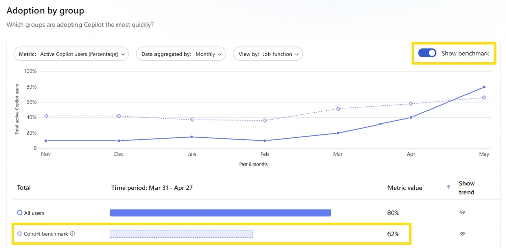 Business leaders want to know how they compare to others with AI transformation. Benchmarks in the Microsoft Copilot Dashboard put your adoption trends in context, so you can compare usage across internal cohorts and see how you stack up against similar organizations. Individual data is not shared and is only presented in aggregate at the group level, ensuring privacy.