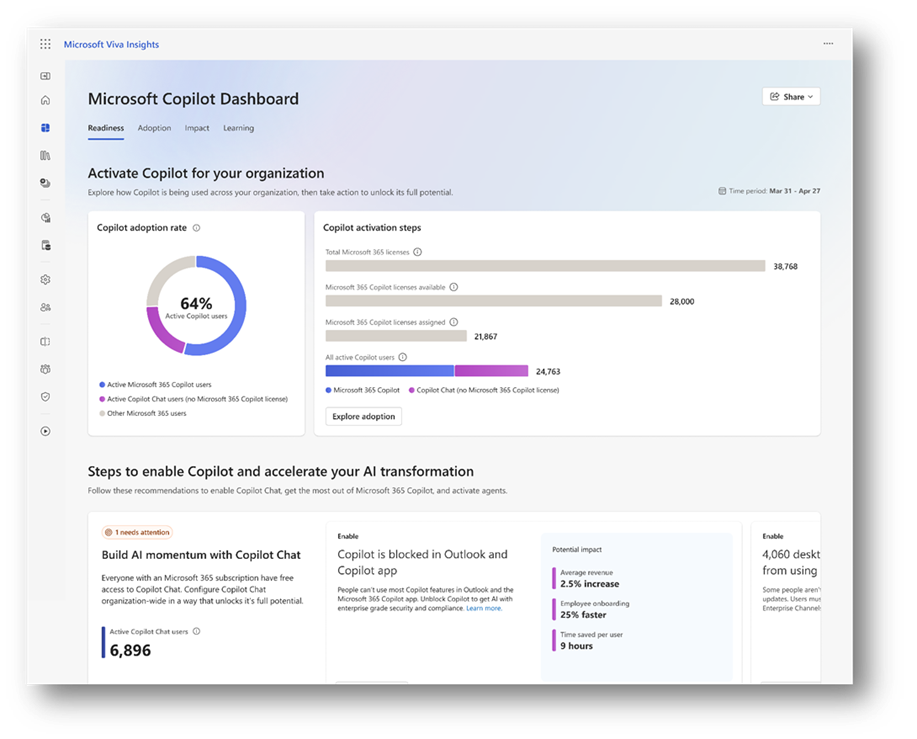 - Readiness Recommendations: Get tailored guidance to maximize Copilot, Copilot Chat, and agent utilization in a revamped readiness page in the Copilot Dashboard.