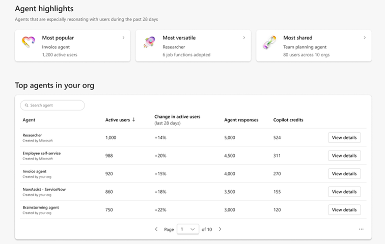With top agent highlights you can learn about the top agents being used in your organization based on active user count, agent responses, and Copilot Credits consumed, while intuitive drilldowns give you the ability to dive deeper into each agent to learn more.