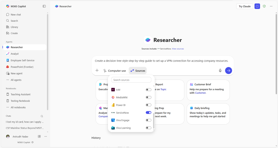 For instance, researcher can create a process diagram and decision tree basis troubleshooting guides. Users can use it to create a decision-tree based step-by-step guide for setting up VPN to access company resources. By scoping the query to authoritative sources like ServiceNow users can ensure that Researcher is only picking up information from official sources.