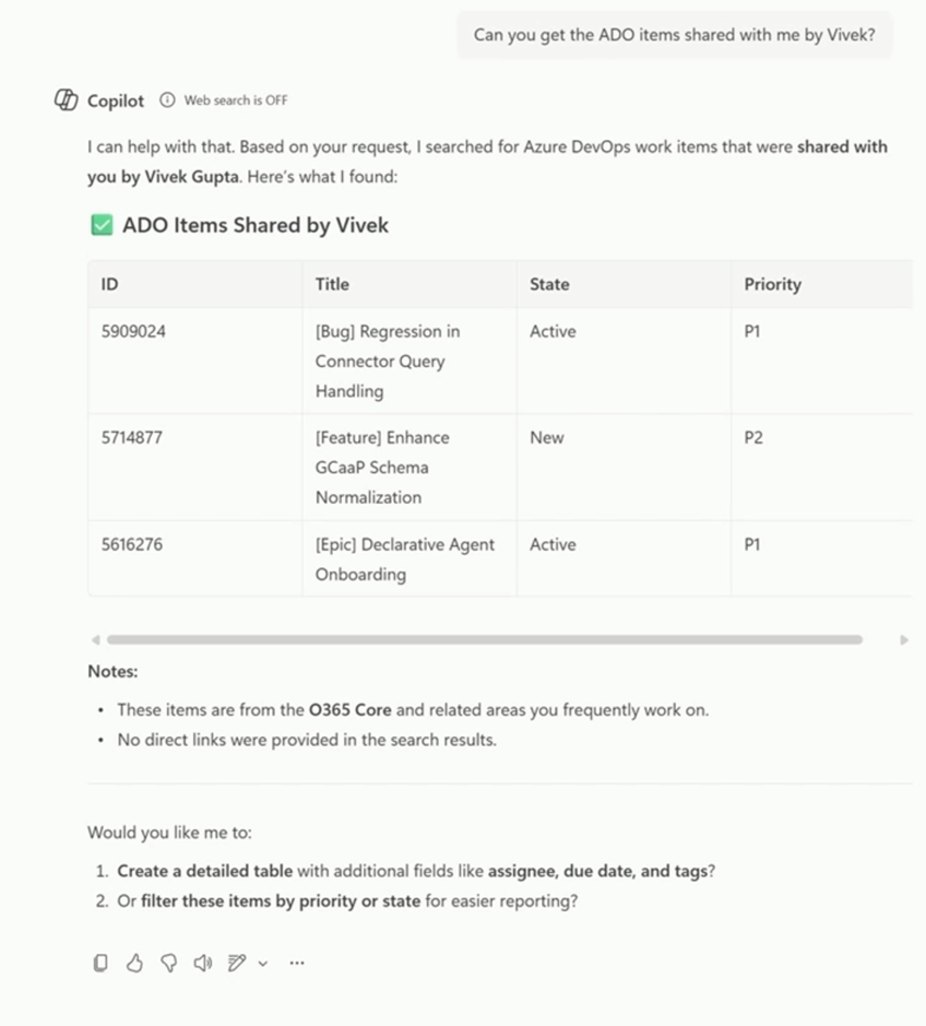 “Get work items shared with me by Vivek” or “Show design docs Priya shared last week”—and Copilot will instantly surface the right items, without the need to search through emails, notifications, or tabs.
