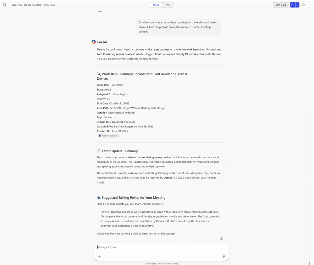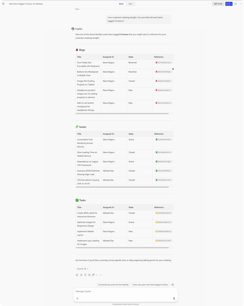 User query: “I've a customer meeting tonight. Can you fetch all work items tagged ‘Contoso’?”