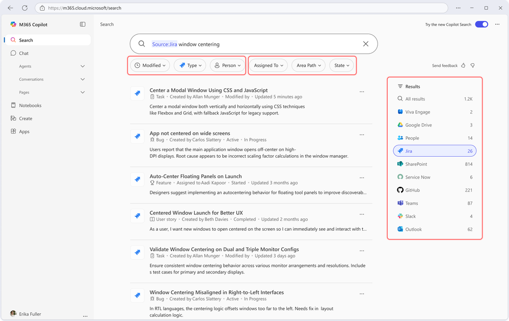 With Conversational Search, you can query sources like Jira or Azure DevOps in plain English — and Copilot translates your request into the right filters automatically.