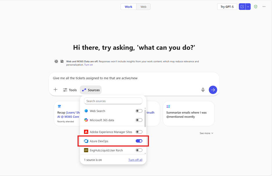 That’s why Copilot lets you decide where it looks. You can focus responses on trusted sources like Azure DevOps for open issues, Confluence for documentation, or Outlook for email threads — ensuring every answer is accurate, relevant, and grounded in the right context.