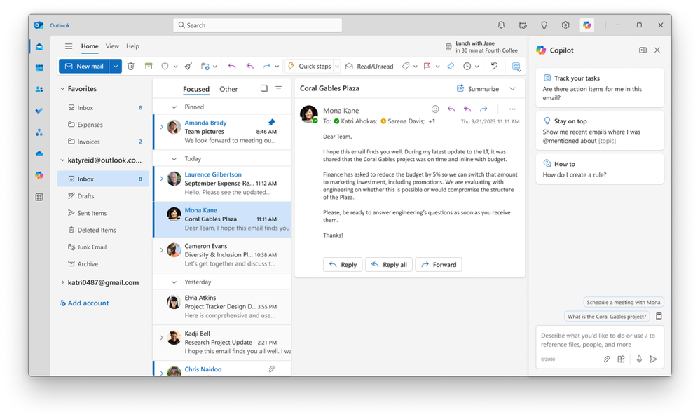 In addition to drafting and summarizing email messages, you can now access Copilot directly in in the new Outlook for Windows and in the web version, using a work or school account, in the same way you do across Microsoft 365. Copilot can help you find a specific email, summarize your meetings, or outline emails in your inbox that may contain an action item for you. You can even use it to go through your inbox in minutes by asking questions like, “What is the latest email from my manager?” or “Show me the emails where I’ve been @mentioned.” Learn more about Copilot in Outlook here.