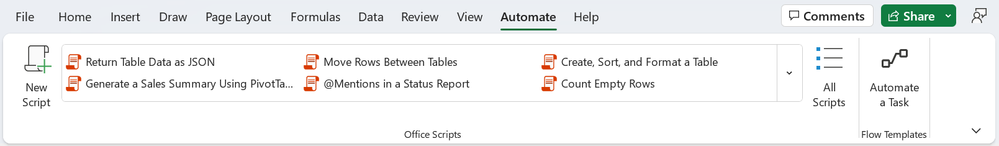 - Open any workbook in Excel for Windows or for Mac and navigate to the Automate tab. Notice that all the scripts in your workbook are available as well as our samples.