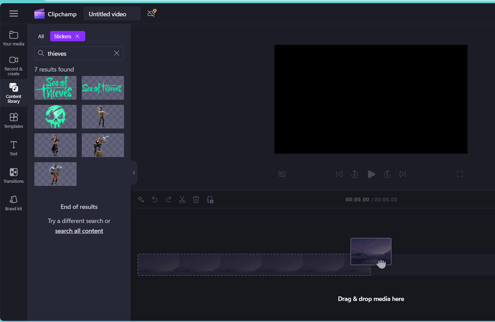 We’ve also added cool Minecraft stickers to Clipchamp, as well as a whole range of Sea of Thieves-themed content: images, videos, music, sound effects, stickers, and GIFs.