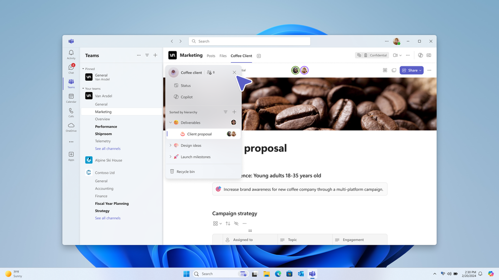 Workspaces in Teams channels help you bring your collaborative documents closer to the conversation and enable you to: