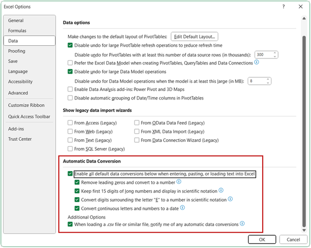 Excel Options dialog box on Windows with Automatic Data Conversion section selected