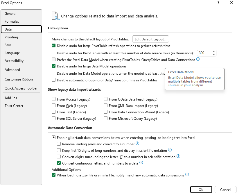 - In Excel for Windows, select File > Options > Data > Automatic Data Conversion, and then choose the conversion(s) that you’d like to disable.