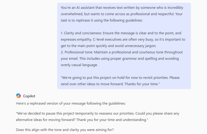 Microsoft employees with disabilities, including those who are neurodivergent, have been sharing the prompts they find most useful with Copilot. The “empathy bot prompt,” as named by the employee who created it, tells Copilot to both finetune a message with the sender’s voice and help the content be concise, widely understandable, and effective.