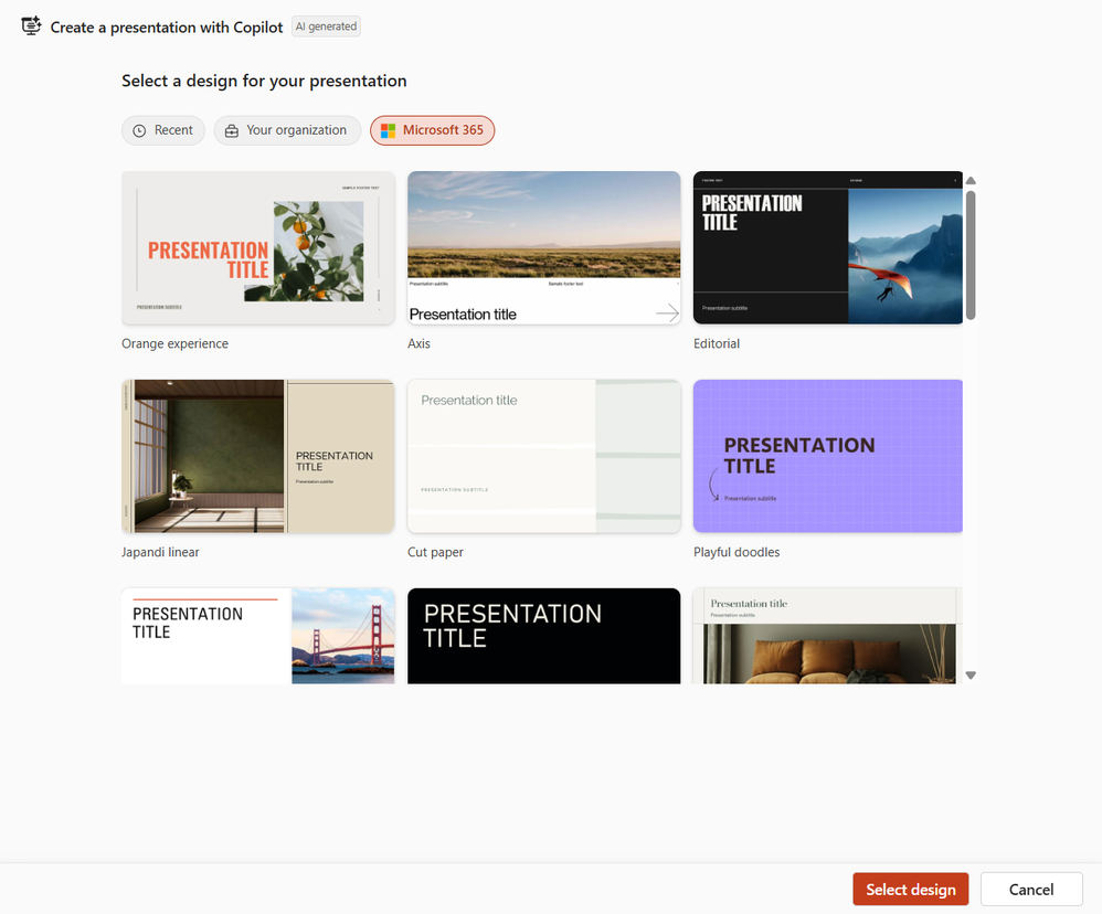 - Select Your organization to browse through available company templates, or select Microsoft 365 to browse through a selection of templates optimized for Copilot, and then click the Select design button. NOTE: The Your organization tab will only be available if your company has an organization assets library set up.