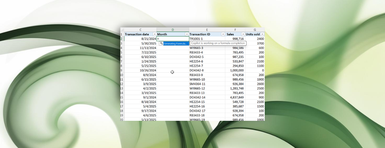 Formula completion is available to Excel for Windows users with a Microsoft 365 Copilot license (get more details on licenses for businesses) and running Version 2510 (Build 19311.20000).