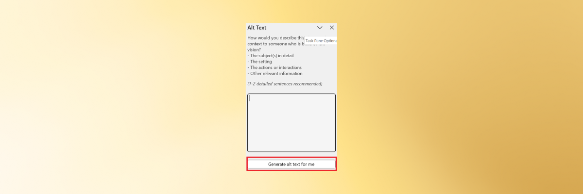 We’d love to hear your thoughts on how this update is working! Open Accessibility Assistant, then select Give Feedback to provide feedback. Alternatively, you can select Give feedback on this alt text in the Alt Text pane for specific feedback on alt text.