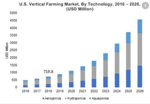 The U.S. Vertical Farming Market is projected to grow from $200 million in 2016 to $2.7 billion by 2026, with technologies like aeroponics, hydroponics, and aquaponics contributing to this growth. |