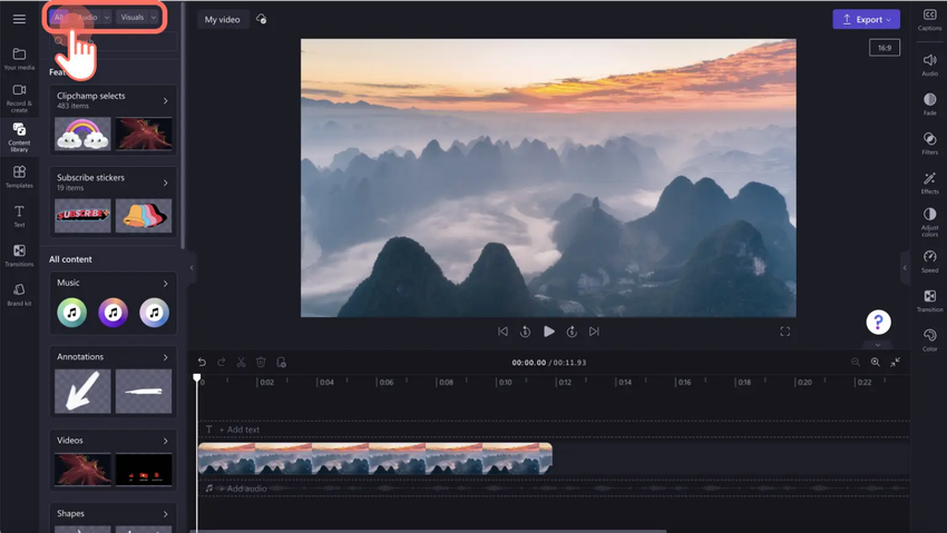 Clipchamp includes built‑in stock content with search and filtering tools that help you quickly find visuals and audio that fit your tone. Whether you’re creating an explainer, announcement, or highlight reel, this can save time and keep everything in one workflow.