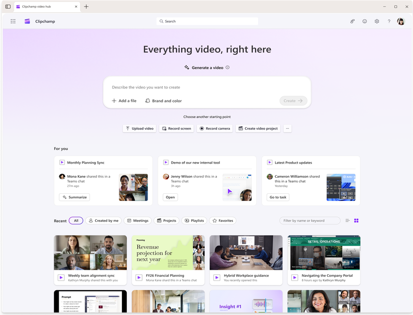 Video is one of the most engaging ways to communicate, but its value depends on how easily it can be consumed. Within the Clipchamp video hub, Copilot enhances the playback experience by making videos searchable, summarized, and interactive. This completes the video flywheel—helping content not just get created and shared, but fully understood and acted on.