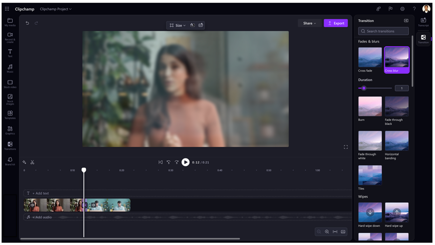 Clipchamp includes subtle fade and smooth transitions between clips without needing complex animations. These effects are easy to apply and work well for professional content like walkthroughs, demos, and internal updates.