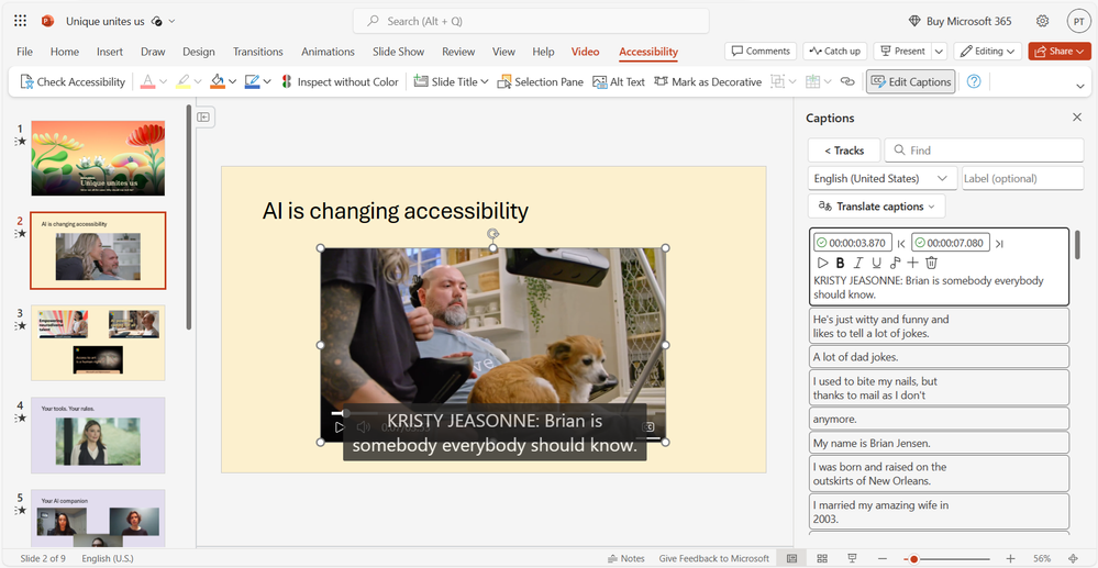 - Make video content more digestible with captions: In PowerPoint, you can enable captions for viewers of your presentations by selecting the video on a slide, then selecting Generate captions and choosing a preferred language. This ensures everyone is able to understand what is being said (learn more). Available to all PowerPoint for the web users.