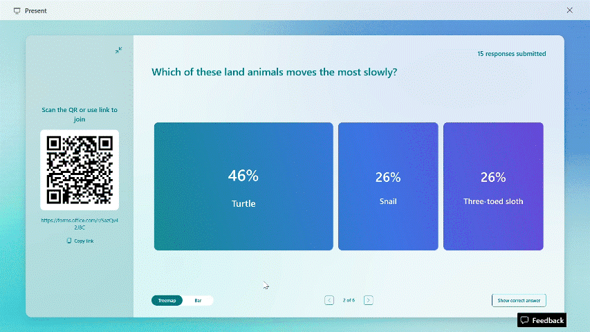 Treemap is a new view that shows the most and least popular answers in real time as attendees answer the questions. If the bar view better suits your needs, you can easily switch. It’s just a click away!