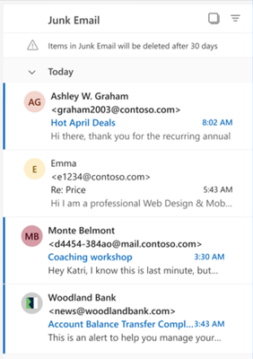 By showing the sender email address next to the sender name in the Junk folder message list, we aim to save you time in investigating whether the mail is legitimate or not, especially if the sender name seems familiar, without opening it or hovering over the name.