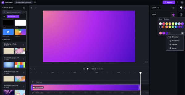 The gradient color picker allows you to create stunning, customizable backgrounds with smooth transitions between colors. Choose from the range of preset options, or create your own gradient with up to six colors. You can also change the gradient pattern to diagonal, horizontal, vertical, or radial. Personal users can add a gradient background from the Content library, while work users can add one from the Graphics tab.
