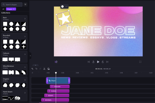 The content library now boasts more than 120 vector shapes, offering you a versatile and dynamic range, from basic shapes to organic and hand-drawn elements. Unlike stickers, these vector shapes can be squished, stretched, recolored, rotated, flipped, and resized to fit any creative need. This flexibility allows for greater customization and precision in your video projects, and makes it easier to achieve the exact look and feel you envision. Personal users can add a shape from the Content library, and work users can add shapes from the Graphics tab.