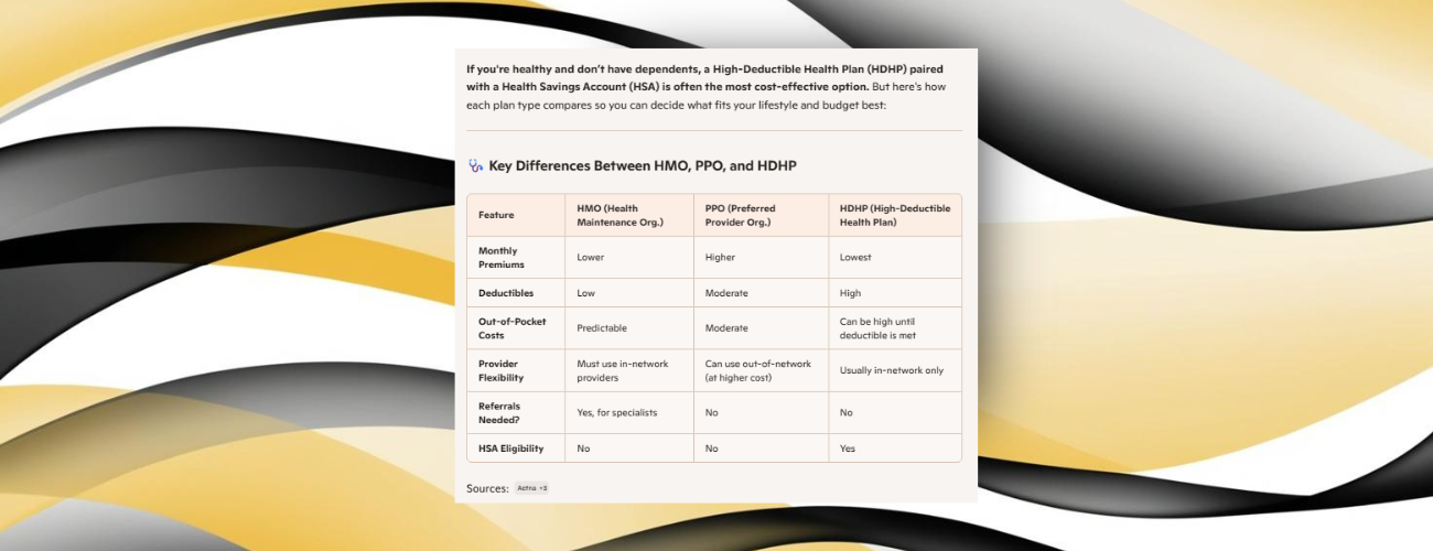 What’s the difference between an HMO, PPO, and HDHP, and which one is best for someone who is healthy and without dependents?