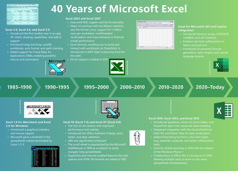 Launched for the Apple Macintosh in September 1985, Excel arrived at a pivotal moment in tech history. Personal computers were becoming more accessible, graphical interfaces were replacing command lines, and the idea of empowering everyday users to manipulate data visually was groundbreaking. Excel’s intuitive grid, powerful formulas, and charting capabilities offered a glimpse into the future of productivity software. It wasn’t just a spreadsheet, but a tool that democratized data – giving businesses, students, and analysts the power to turn numbers into insights and quietly laying the foundation for a digital age where data would become king. Electronic spreadsheets, and in particular Excel, paved the way for advanced workflows on computers, during a time when there was skepticism around the value of PCs.