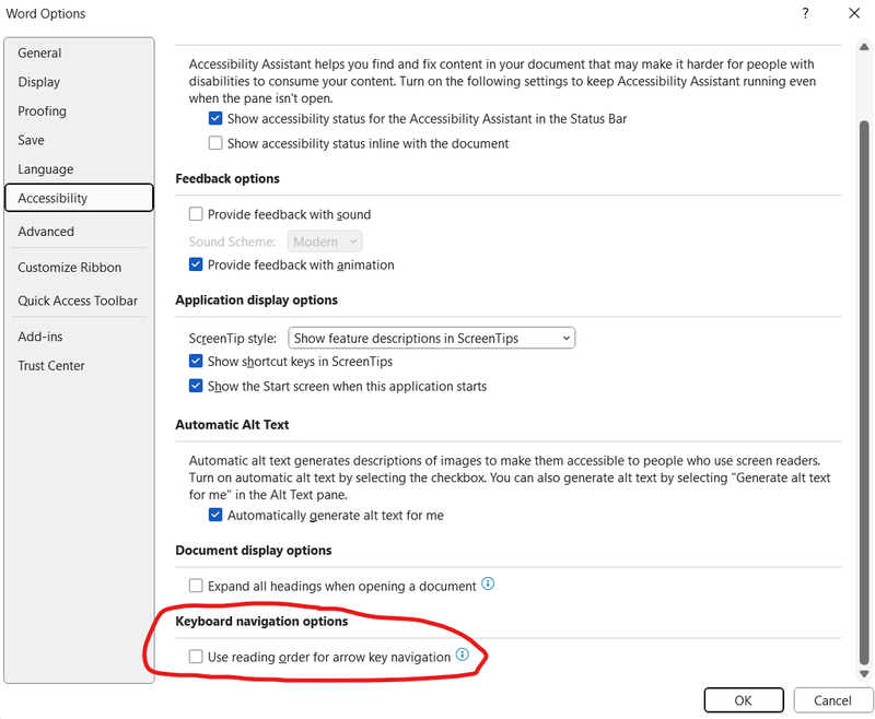 - Press the Tab key until you get to the Use reading order for arrow key navigation check box, and then press Space to select it.