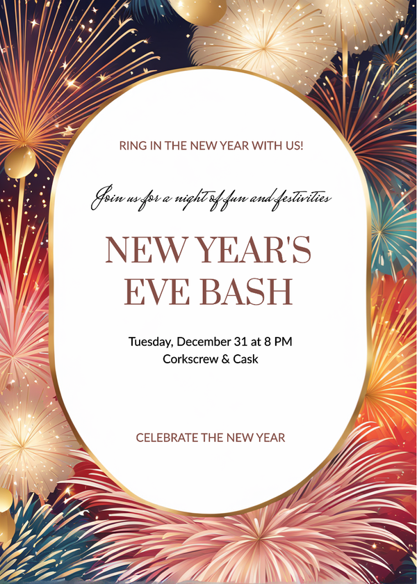Sample prompt: New Year’s party invite at Corkscrew & Cask with fireworks in the background