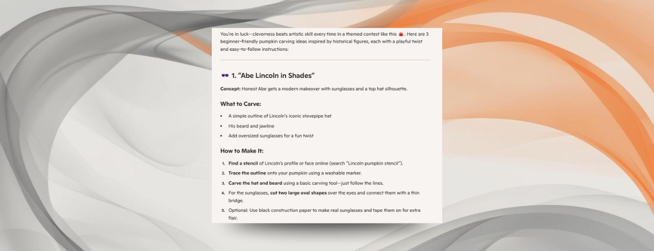 Hi, Insiders! Halloween is just around the corner, and while you probably have your costume all picked out, there may still be a few more items on your to-do list. Whether you’re looking to win your neighborhood’s pumpkin decorating contest or wow party guests with an on-theme dessert, Microsoft Copilot has plenty of advice to dish out.