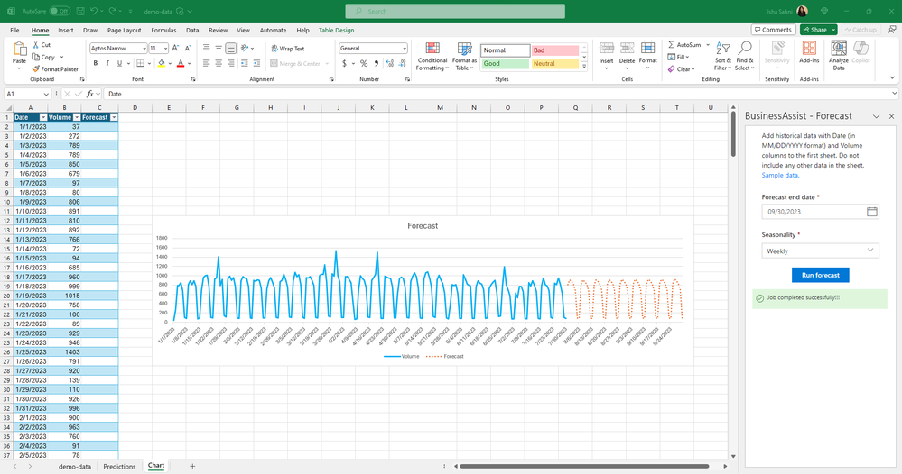 Hi, Microsoft 365 Insiders! My name is Isha Sahni and I’m a Sr. Product Manager on the Customer Success Engineering team. I’m excited to announce that you can now get the Business Assist - Forecast service, now in preview, through Office Add-ins.