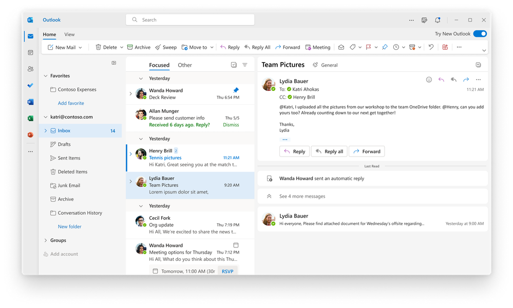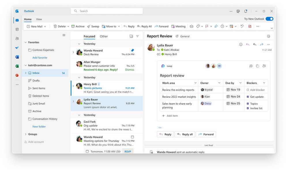 Today, we are taking our next step by sharing a preview of the new Outlook for Windows, designed to bring consistency across our Windows and web codebases to help you be more productive and stay in control of your inbox. This version has new intelligent features like message reminders and a new calendar board that puts your email, calendar, and To Do in the same view. In addition, with Microsoft Loop components, you can collaborate across Outlook and Teams while staying in the flow.
