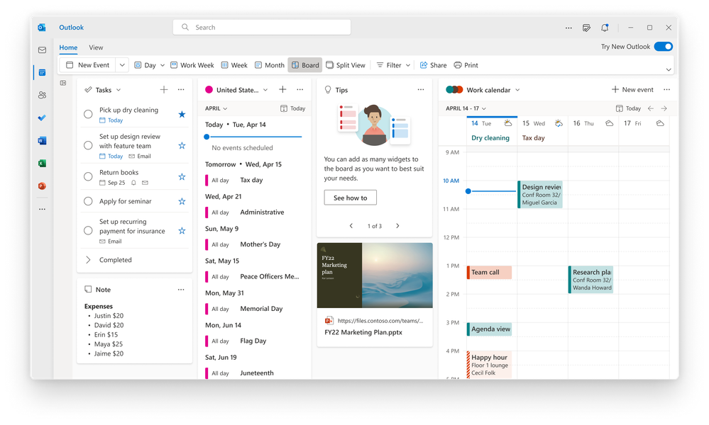 Everyone has a unique style when it comes to staying productive and with the Outlook calendar board view you can make it as unique as you. Calendar board allows you to organize your most important stuff and manage it all in one view. Add calendars, files, To Do lists, goals – The possibilities are endless.