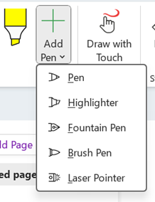 1. If the Fountain Pen and Brush Pen don’t appear on the Draw tab, select the Add Pen button, and then select that pen or pens you want to add.
