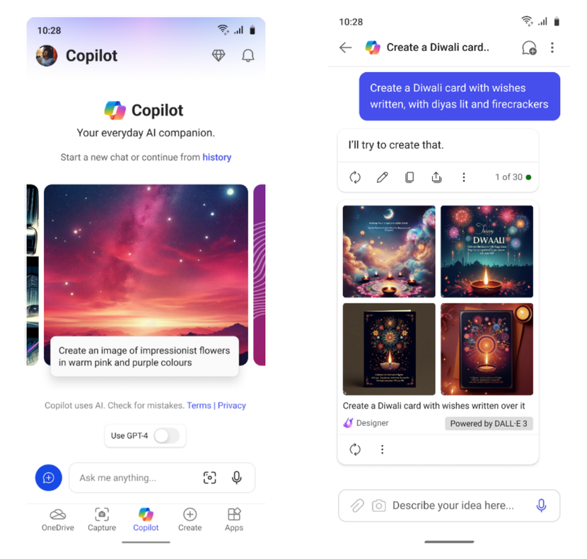 Copilot for the Microsoft 365 mobile app is now front and center giving you a free AI assistant to use within your workflow to boost productivity through search, chat, and image generation, powered by the latest OpenAI models, GPT-4 and DALL·E 3. You can easily export your Copilot output to Word for editing and saving for future access.