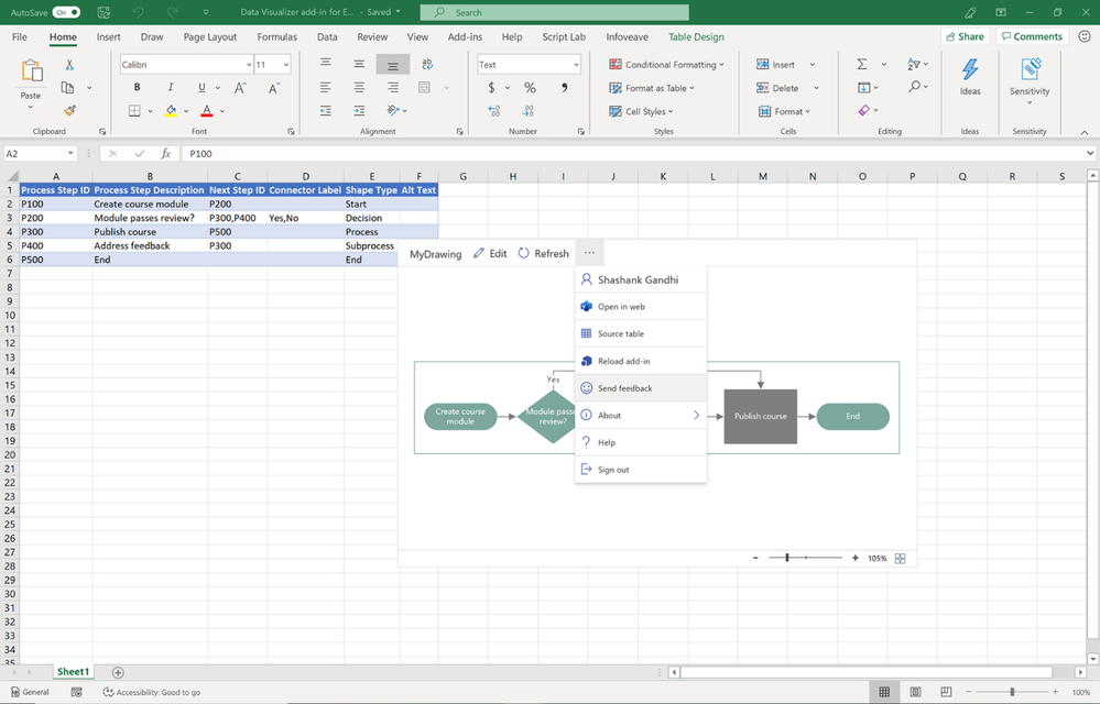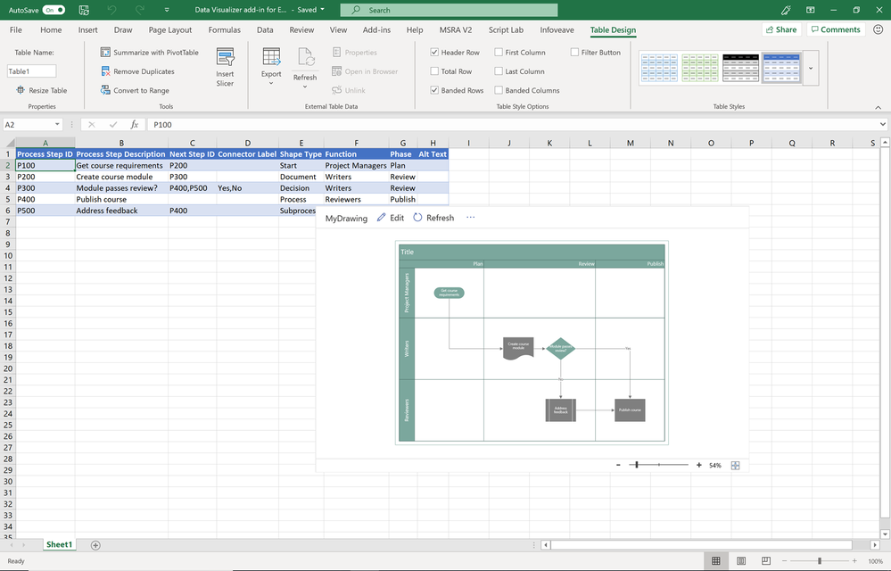 Earlier this year, we released for private preview the Data Visualizer add-in for Excel, a new way to create data-driven Visio diagrams directly in Excel. As a quick recap, you can automatically create high-quality flowcharts, cross-functional flowcharts (or Swimlane diagrams), and organizational charts—all the shapes, connections, and data linking—from data in Excel tables. The feature was only available to an exclusive group of users who requested a verification code—until today.