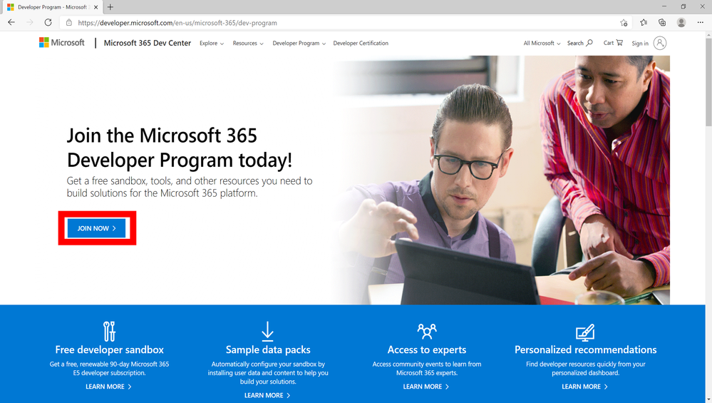 - Go to the Microsoft 365 Developer Program website and select JOIN NOW.