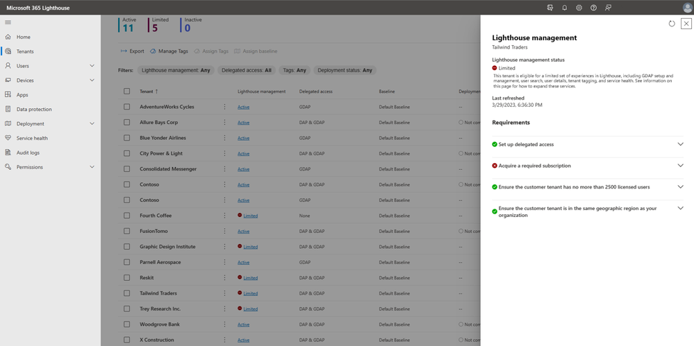 An image of the Microsoft 365 Lighthouse tenant page and the customer requirements flyout which highlights the Lighthouse management status and Requirements for the example Tailwind Trader tenant.