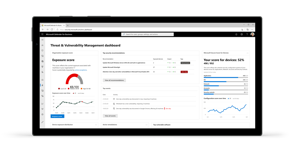 - Threat and vulnerability management – Helps you to prioritize and focus on the weaknesses that pose the most urgent and the highest risk to your business. By discovering, prioritizing, and remediating software vulnerabilities and misconfigurations you can proactively build a secure foundation for your environment.