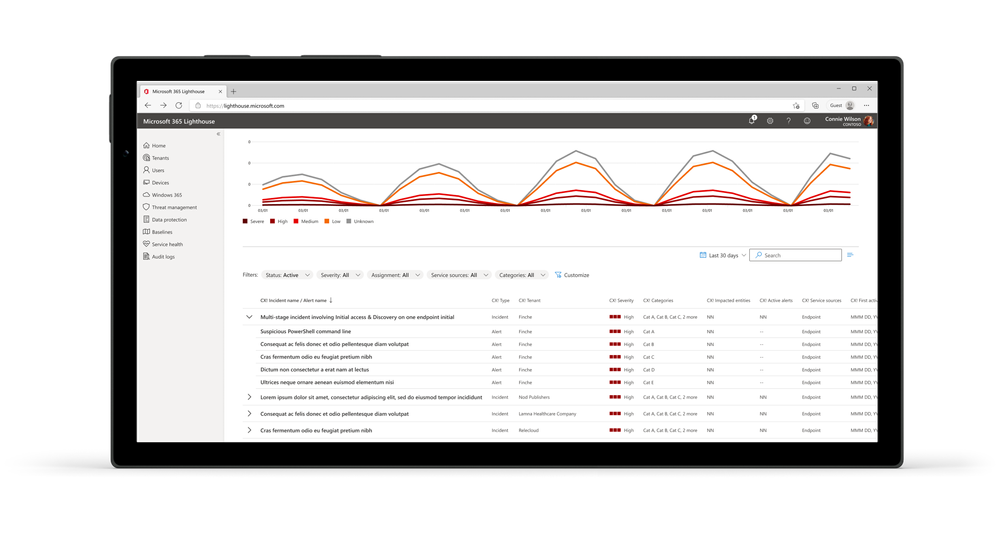Figure 5: Security incident queue within Microsoft 365 Lighthouse helps IT partners identify security incidents and alerts across multiple customers.Learn more