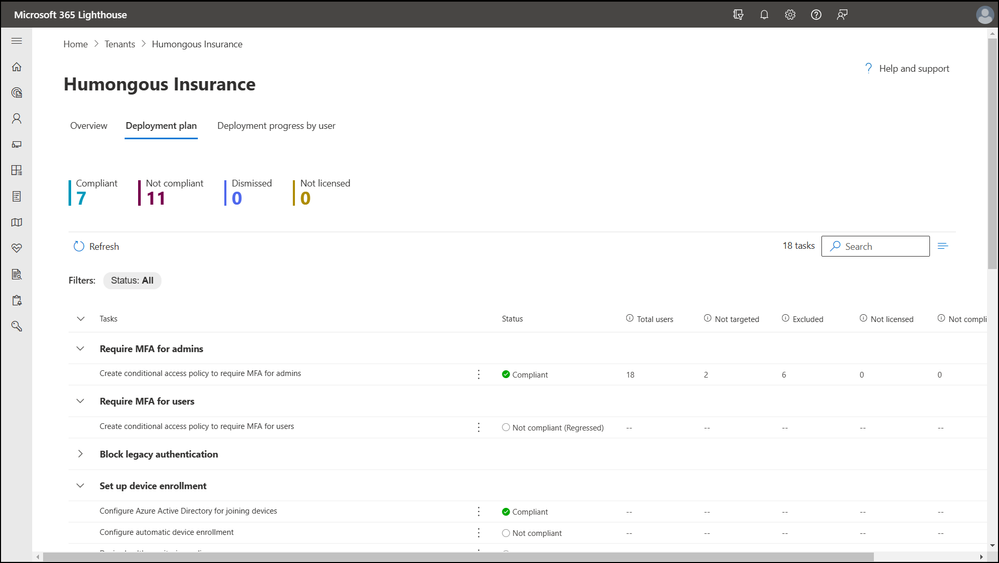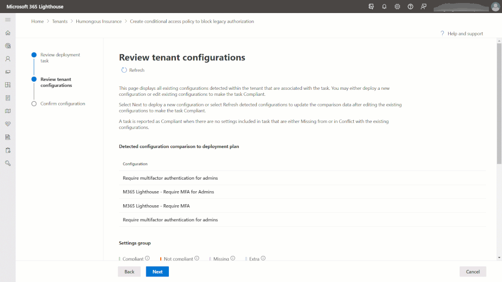 To do this, Lighthouse will detect any intersecting configurations that are already deployed to the tenant and compare them to the deployment plan, showing which settings for which users within which configurations are compliant, not compliant, missing, or extra.