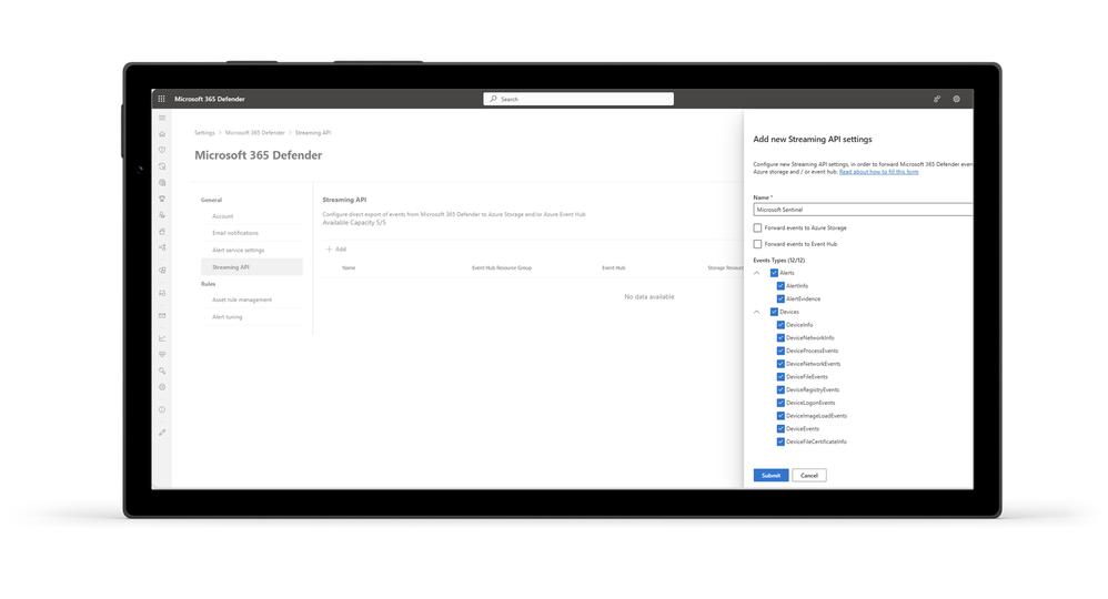For partners or customers looking to build their own security operations center, we are announcing the public preview of streaming API that supports streaming of device file, registry, network, logon events and more to Azure Event Hub, Azure Storage, and Microsoft Sentinel to support advanced hunting and attack detection. If you are using the Streaming API for the first time, you can find step-by-step instructions in the Microsoft 365 Streaming API Guide on configuring the Microsoft 365 Streaming API to stream events to your Azure Event Hubs or to your Azure Storage Account.