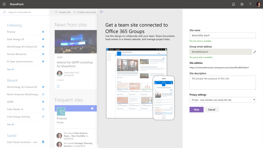 With SharePoint Multi-Geo, satellite geos now get the rich SharePoint Online functionalities in addition to the OneDrive functionalities. SharePoint Home experience shows a curated list of News roll-up and Suggested sites powered by the intelligence of the Office graph, which analyzes the activities and signals from across the global organization and tailors a list for every user.