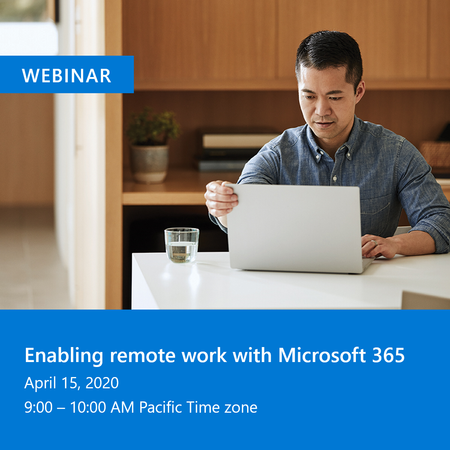 Hello, everyone out there in remote work world! We will kick off our Part 1 of our webcast series: ‘Enabling remote work with Microsoft 365’ at April 15, 2020 at 9:00 AM PT. Be sure to add it to your...